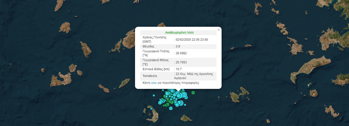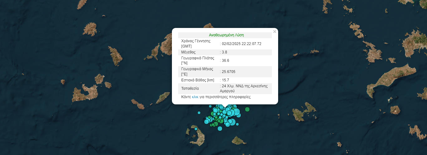 Σύμφωνα με την Αυτόματη Λύση του Γεωδυναμικού Ινστιτούτου, το επίκεντρο του δεύτερου σεισμού εντοπίστηκε 24 χλμ νότια-νοτιοδυτικά της Αρκεσίνης Αμοργού, με εστιακό βάθος 15,7 χλμ.
