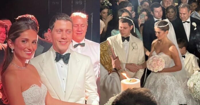 Η νύφη, μόλις 24 ετών, εντυπωσίασε με το στράπλες ολοκέντητο νυφικό της και τα διακριτικά κοσμήματα που επέλεξε. Τα μαλλιά της ήταν αρχικά πιασμένα σε έναν κομψό κότσο και στη συνέχεια τα άφησε ελεύθερα, προσδίδοντας μια αίσθηση χαλαρότητας και κομψότητας στην εμφάνισή της.