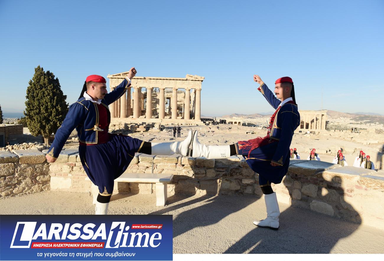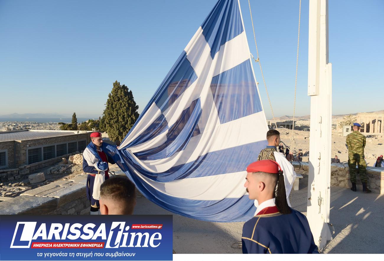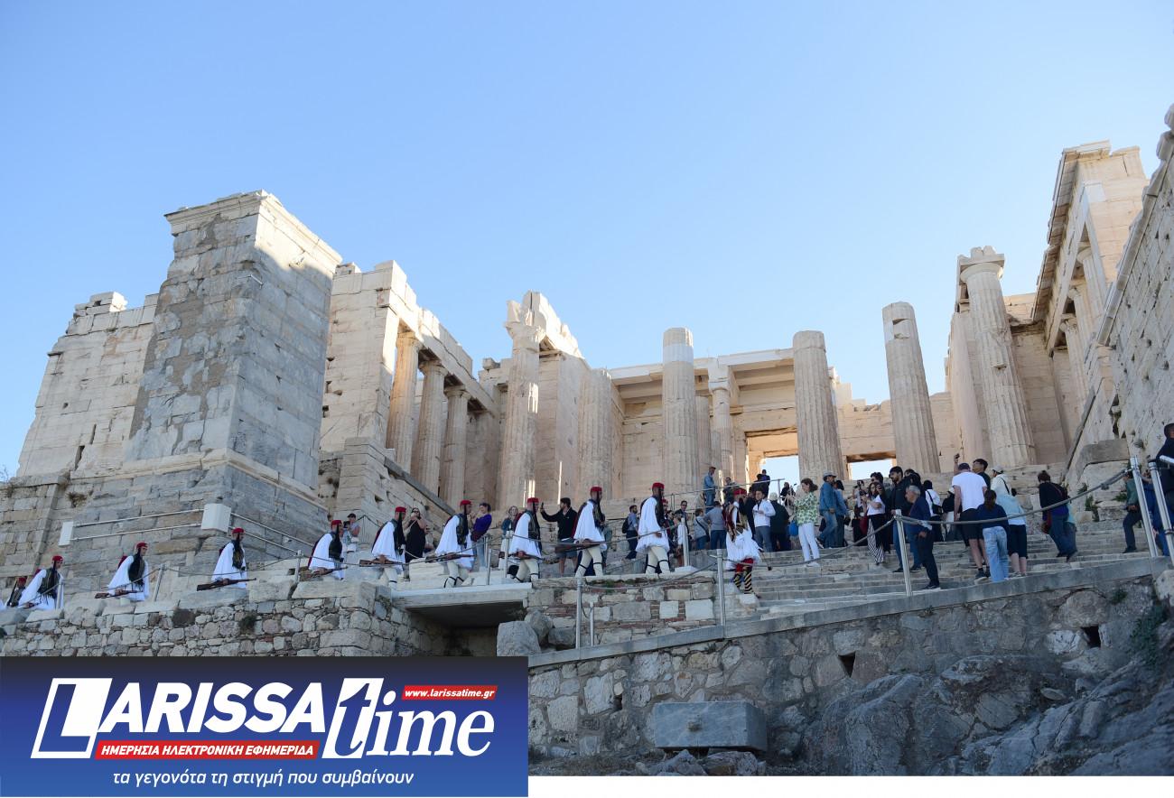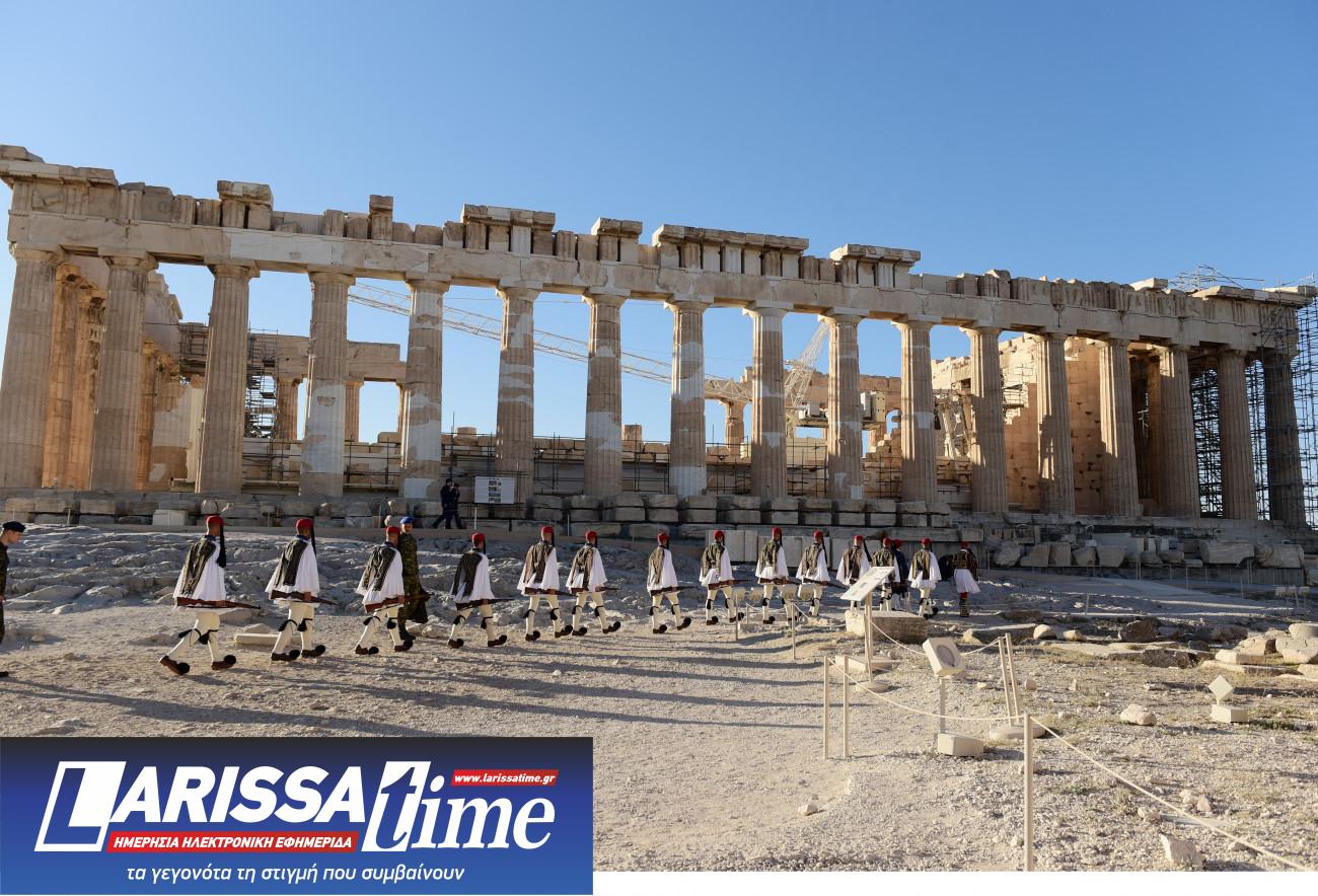 Όσοι βρέθηκαν το πρωί της Δευτέρας στον Ιερό Βράχο παρακολούθησαν τους Εύζωνες της Προεδρικής Φρουράς να υψώνουν στον ιστό την ελληνική σημαία.