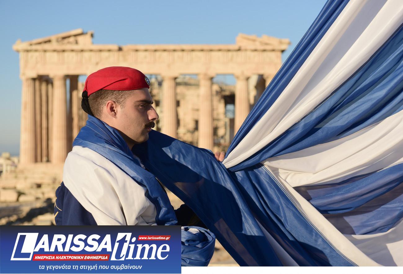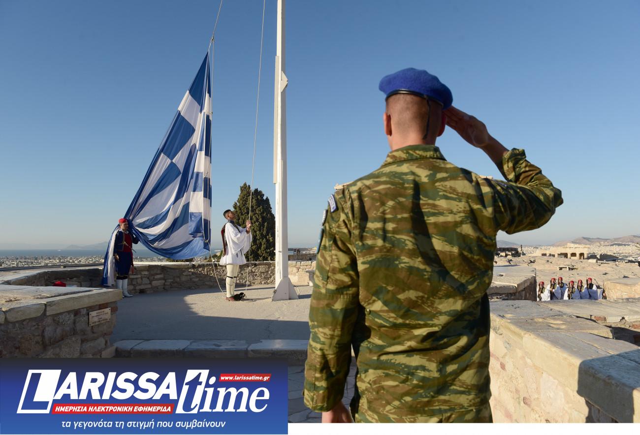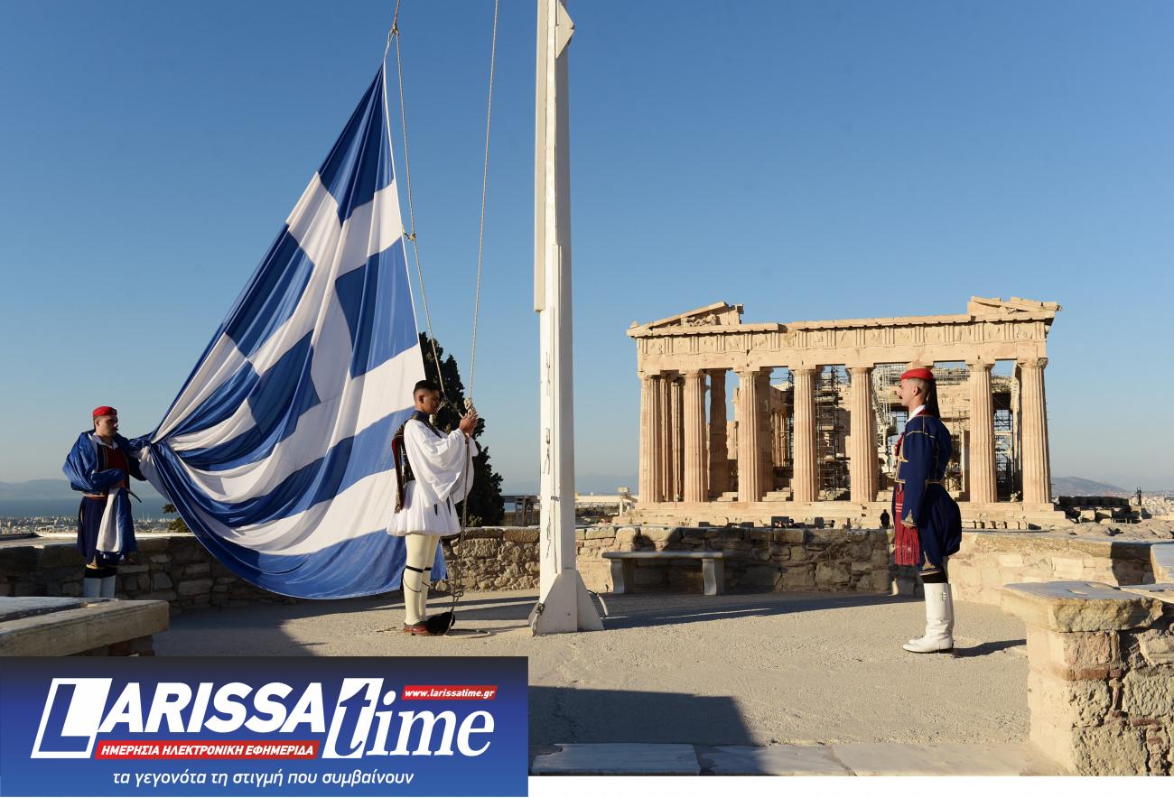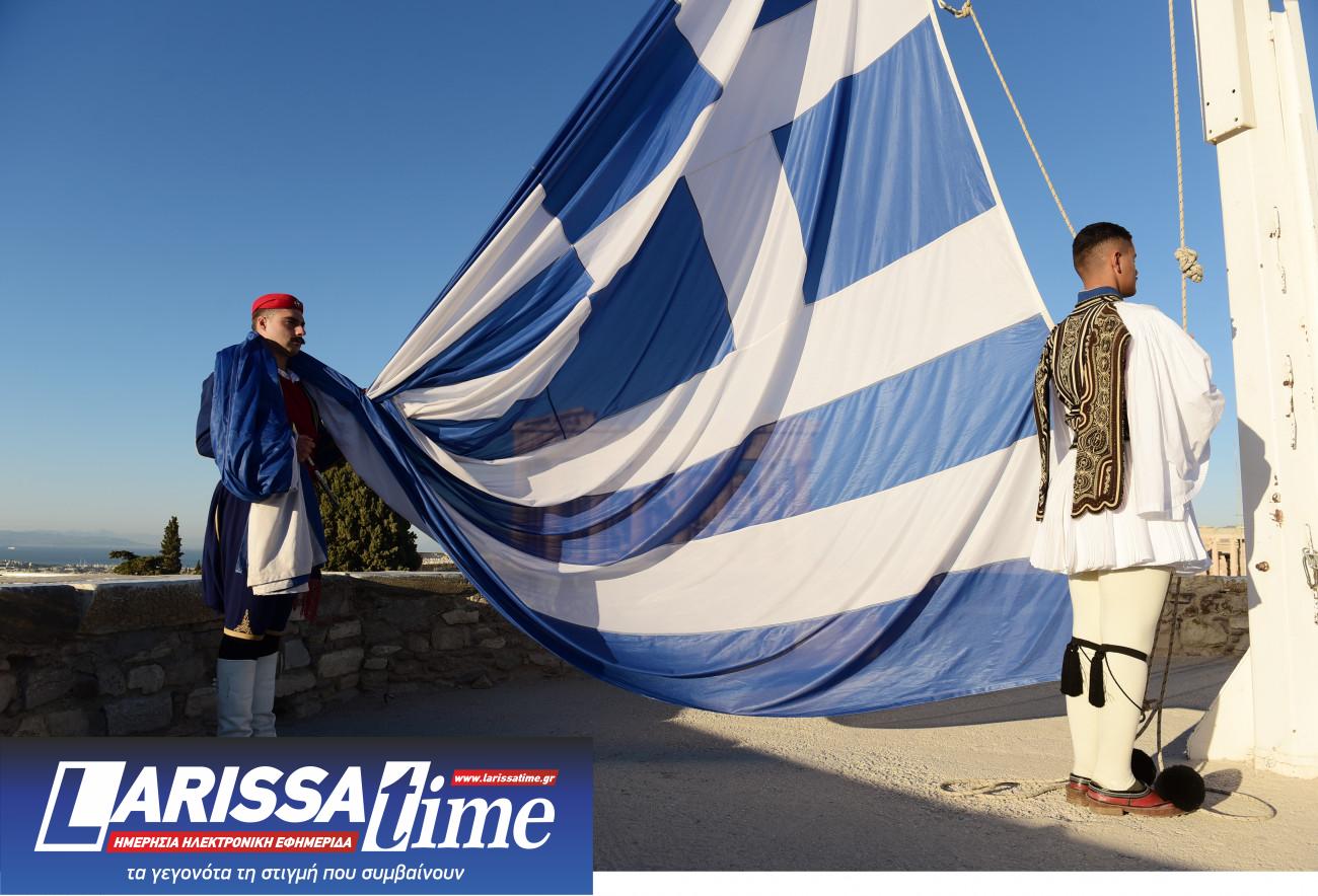 Όσοι βρέθηκαν το πρωί της Δευτέρας στον Ιερό Βράχο παρακολούθησαν τους Εύζωνες της Προεδρικής Φρουράς να υψώνουν στον ιστό την ελληνική σημαία.