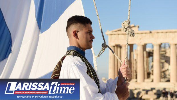 Όσοι βρέθηκαν το πρωί της Δευτέρας στον Ιερό Βράχο παρακολούθησαν τους Εύζωνες της Προεδρικής Φρουράς να υψώνουν στον ιστό την ελληνική σημαία.