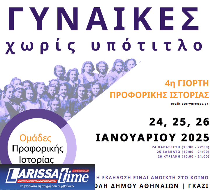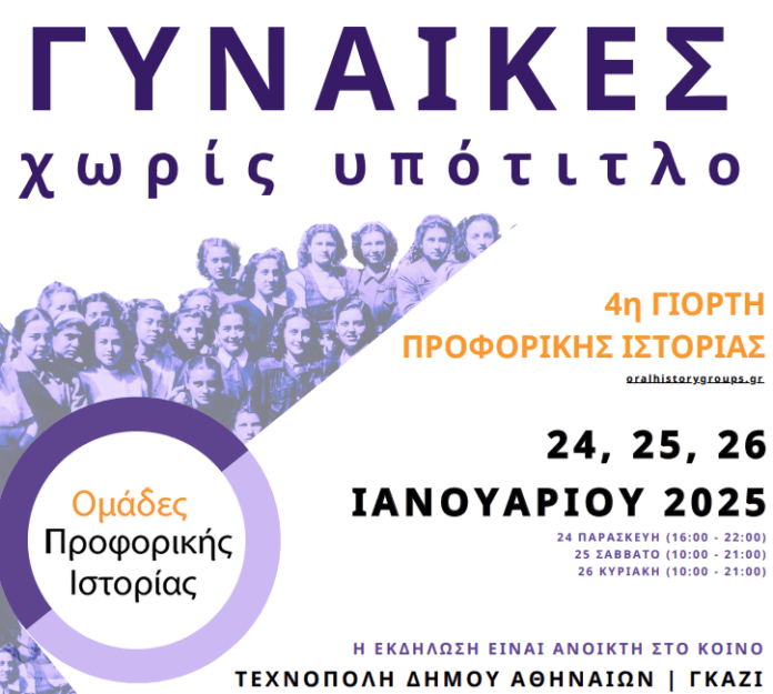 Η 4η Γιορτή Προφορικής Ιστορίας με θέμα ΓΥΝΑΙΚΕΣ – χωρίς υπότιτλο θα διαρκέσει τρεις μέρες: Παρασκευή 24 Ιανουαρίου (16.00 – 22.00), Σάββατο (10.00 – 21.00) και Κυριακή 26 Ιανουαρίου 2025 (10.00 – 21.00). Θα γίνει στην Τεχνόπολη του Δήμου Αθηναίων, Αεροφυλάκιο 1, Αμφιθέατρο «Μιλτιάδης Έβερτ».