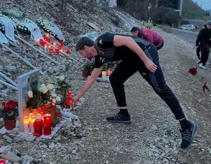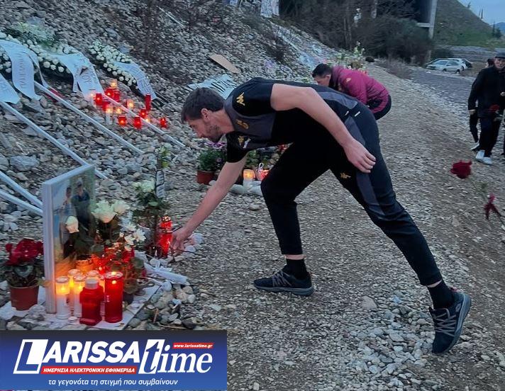 Εκεί κατέθεσε 57 τριαντάφυλλα τιμώντας έτσι τη μνήμη των συνανθρώπων μας που έφυγαν τόσο άδικα από τη ζωή σε μια συγκλονιστική στιγμή και για τους ποδοσφαιριστές της ομάδας οι οποίοι στάθηκαν μπροστά στα αναμμένα κεριά αλλά και στις φωτογραφίες των θυμάτων που τόσο άδικα έφυγαν από τη ζωή.