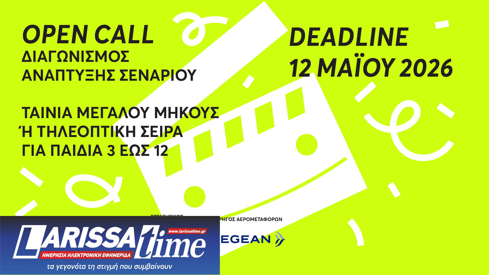 Για πέμπτη συνεχή χρονιά το Παιδικό και Εφηβικό Διεθνές Φεστιβάλ Κινηματογράφου Αθήνας και το Cinekid προκηρύσσουν τον Διαγωνισμό Ανάπτυξης Σεναρίου, για ταινία μεγάλου μήκους και τηλεοπτική σειρά με παιδικό περιεχόμενο που απευθύνεται στις ηλικίες 3 – 12 ετών.