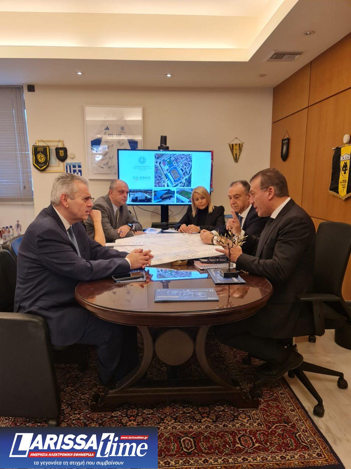 Ο κ. Βρούτσης συναντήθηκε με τους Βουλευτές Λάρισας, τον Υφυπουργό Αγροτικής Ανάπτυξης και Τροφίμων, Χρήστο Κέλλα, τον γραμματέα της κοινοβουλευτικής ομάδας της ΝΔ, Μάξιμο Χαρακόπουλο και τον Χρήστο Καπετάνο, καθώς και με την αντιπρόεδρο του ΕΑΚ Λάρισας, Στέλλα Χαρακοπούλου, παρουσία της προϊσταμένης της Διεύθυνσης τεχνικών αθλητικών έργων και υποδομών, Ζωή Σιδέρη.