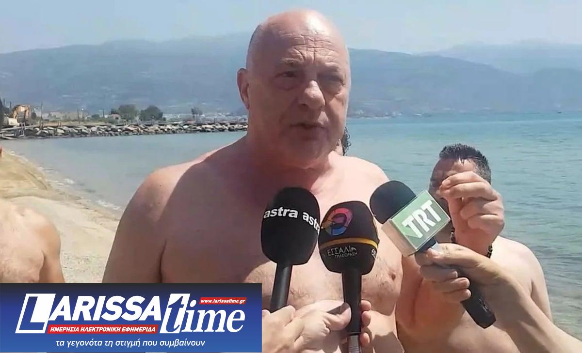 Μάλιστα, ο δήμαρχος Βόλου εμφανίστηκε με μαγιό, αποφασίζοντας να κάνει μπάνιο για να αποδείξει ότι τα νερά του Παγασητικού είναι καθαρά και δεν υπάρχει κάποιο πρόβλημα από τα υλικά που έπεσαν στη θάλασσα λόγω της κακοκαιρίας Daniel.
