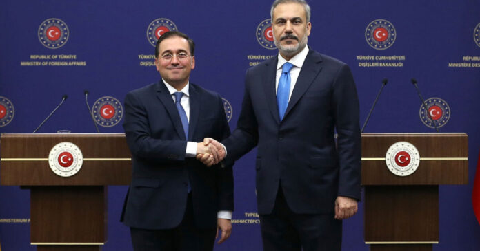 Εν τω μεταξύ, ο υπουργός Εξωτερικών της Τουρκίας Χακάν Φιντάν υποδέχθηκε στην Αγκυρα τον Ισπανό ομόλογό του Χοσέ Μανουέλ Αλμπάρες Μπουένο και στην κοινή συνέντευξη Τύπου αναφερόμενος στις σχέσεις της χώρας του με τις Βρυξέλλες τόνισε ότι «τα γεγονότα στην περιοχή μας τα τελευταία χρόνια έχουν φέρει στο προσκήνιο την προοπτική ασφάλειας όσον αφορά τις σχέσεις της Ευρωπαϊκής Ενωσης, του ΝΑΤΟ και της Τουρκίας. Από αυτή την άποψη υπάρχουν πολύ σοβαρά ζητήματα που σχετίζονται με την ασφάλεια και τα οποία πρέπει να συζητηθούν μεταξύ της Τουρκίας και της Ευρωπαϊκής Ενωσης, τόσο διμερώς [σ.σ. Τουρκία – Ε.Ε.] όσο και στο πλαίσιο του ΝΑΤΟ. Νομίζω πως αυτό που μπορούν να κάνουν και οι δύο πλευρές [σ.σ. Τουρκία – Ε.Ε.], ειδικά όσον αφορά την περιφερειακή και την παγκόσμια ασφάλεια, δεν έχει συζητηθεί πλήρως».