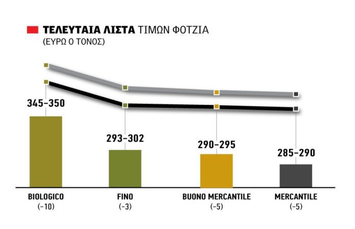 Για την ώρα, τα παραπάνω οδηγούν τη Φότζια σε μία ακόμη βδομάδα ελαφράς μείωσης, αυτή τη φορά κατά 3 – 5 ευρώ ο τόνος στα συμβατικά και 10 ευρώ ο τόνος στα βιολογικά σιτάρια. Συγκεκριµένα, η νέα λίστα στη Φότζια δίνει στα ποιοτικά σιτάρια (Fino) µε ειδικό βάρος 79,5-80 kg/hl, υαλώδη 80% και πρωτεΐνη 12-12,5% τιµή αποθήκης εµπόρου στα 297 – 302 ευρώ ο τόνος και στη δεύτερη ποιότητα (Buono Mercantile) µε ειδικό βάρος 78 kg/hl, υαλώδη 65% και πρωτεΐνη 11-11,5% τιµή αποθήκης εµπόρου στα 295 – 300 ευρώ ο τόνος. Η τρίτη ποιότητα µε ειδικό βάρος 76 kg/hl, υαλώδη 50% (Mercantile) παίζει πλέον στα 285 µε 290 ευρώ ο τόνος.