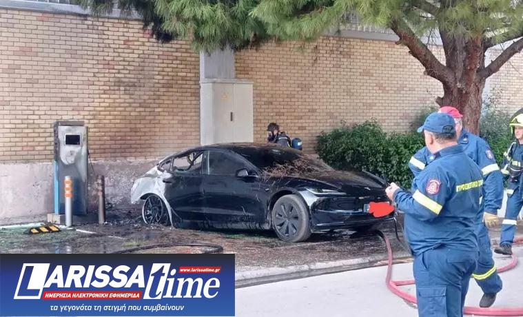 Στις φλόγες τυλίχθηκε ένα ηλεκτροκίνητο αυτοκίνητο, μάρκας Tesla, ενώ φόρτιζε έξω από σούπερ μάρκετ στην Αγία Παρασκευή.