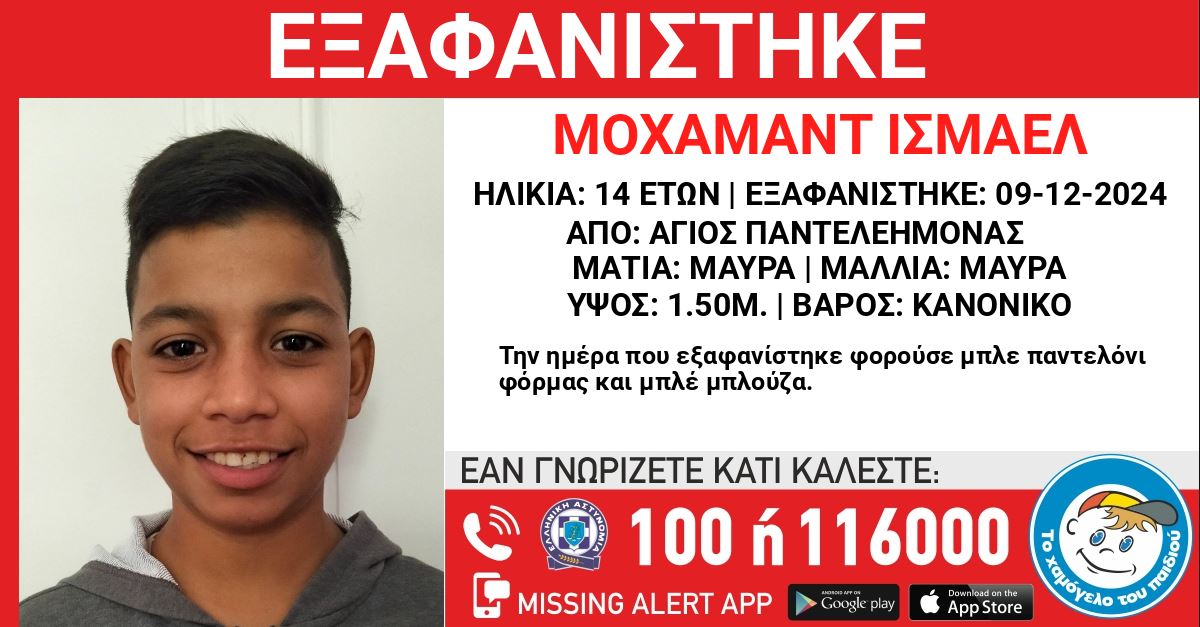 «Το Χαμόγελο του Παιδιού ενημερώθηκε σήμερα για την εξαφάνιση του ανήλικου Μοχάμαντ Ισμαέλ και κατόπιν εισαγγελικής εντολής προχώρησε άμεσα στη δημοσιοποίηση των στοιχείων του, καθώς συντρέχουν λόγοι που θέτουν την ζωή του σε κίνδυνο», αναφέρεται στην ανακοίνωση.