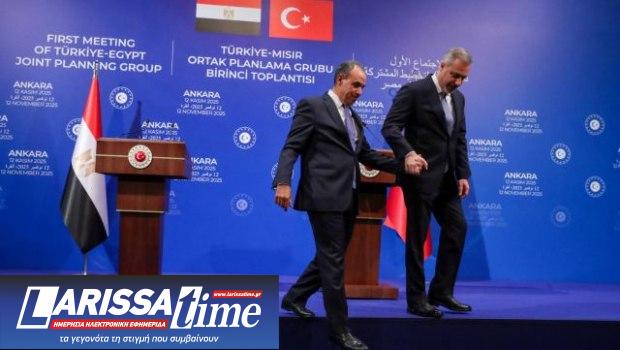 Ο υπουργός Εξωτερικών της Αιγύπτου, Μπαντρ Αμπντελάτι, επισκέφθηκε χθες Τετάρτη την Αγκυρα, όπου συναντήθηκε με τον τούρκο ομόλογό του Χακάν Φιντάν (δεξιά, στη φωτογραφία του Reuters/Cagla Gurdogan, επάνω, κατά την αποχώρησή τους πιασμένοι από το χέρι μετά την κοινή συνέντευξη Τύπου).