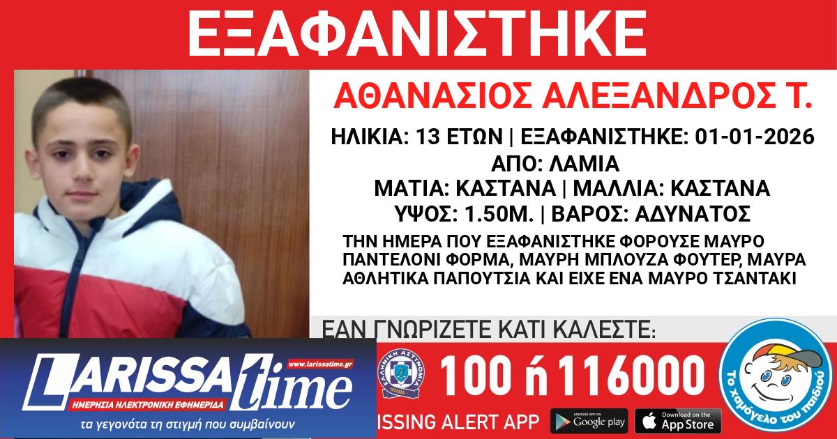 Αγωνία επικρατεί για την τύχη ενός 13χρονου αγοριού, που εξαφανίστηκε στη Λαμία.