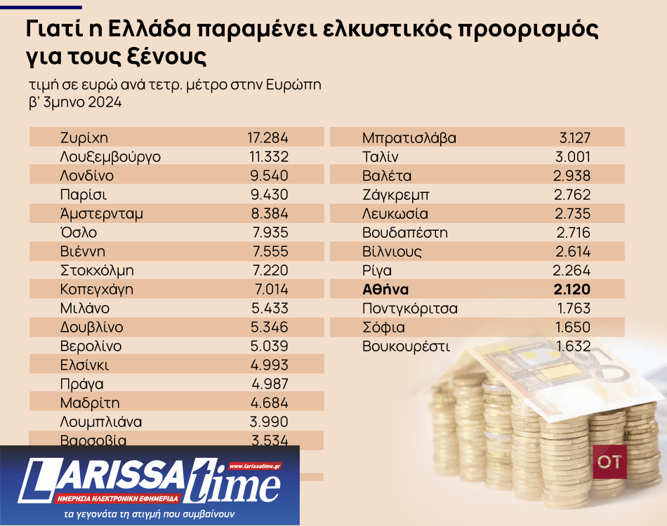 Την ίδια στιγμή, οι τιμές στις χώρες προέλευσης των αγοραστών από το εξωτερικό βρίσκονται σε δυσθεώρητο ύψος. Είναι χαρακτηριστικό ότι στο Άμστερνταμ, την ίδια περίοδο, το μέσο κόστος αγοράς διαμορφώθηκε σε 8.385 ευρώ/τ.μ. για ένα τυπικό διαμέρισμα στο κέντρο της πόλης, τιμή που είναι σχεδόν 4 φορές υψηλότερη από της Αθήνας.