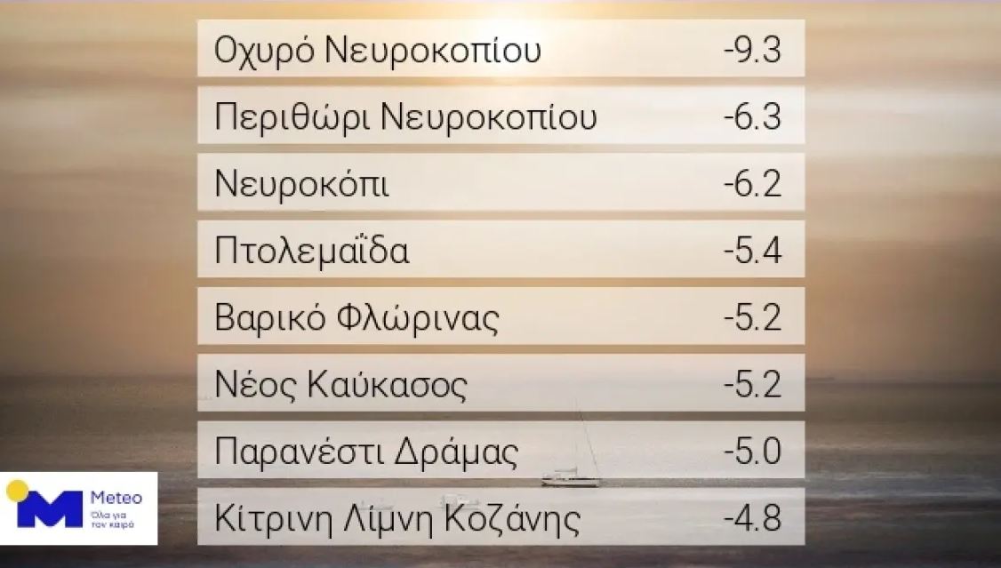 Συγκεκριμένα, σύμφωνα με το δίκτυο αυτόματων μετεωρολογικών σταθμών του meteo.gr / Εθνικού Αστεροσκοπείου Αθηνών, η ελάχιστη θερμοκρασία σημειώθηκε στο Οχυρό Νευροκοπίου (-9.3 °C) και ακολούθησαν το Περιθώρι Νευροκοπίου (-6.3°C) και το Νευροκόπι (-6.2°C).