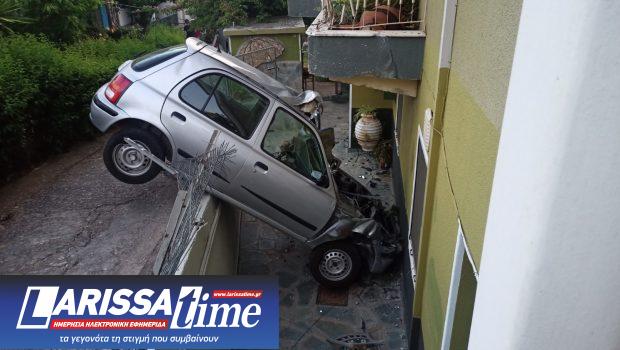 Κάτω από άγνωστες συνθήκες, το όχημα σε κλειστή δεξιά στροφή εξετράπη της πορείας του, έφυγε ευθεία και «προσγειώθηκε» σε αυλή σπιτιού, αφού πρώτα προσέκρουσε σε μπαλκόνι του.