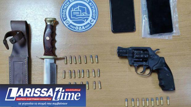 Στην κατοχή του συλληφθέντα οι αστυνομικοί της Υποδιεύθυνσης Ασφάλειας Αγρινίου βρήκαν και κατέσχεσαν ένα περίστροφο οπλισμένο με εννέα φυσίγγια. Ενα μαχαίρι και 21 ακόμη φυσίγγια και δύο κινητά τηλέφωνα.