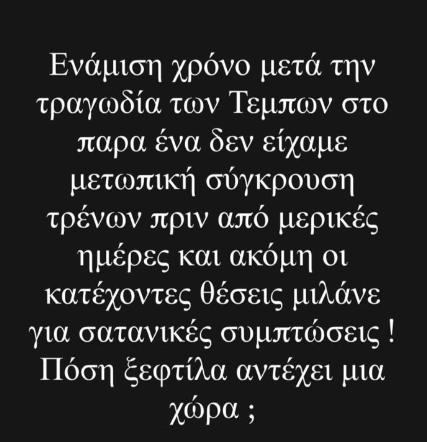 «Ενάμιση χρόνο μετά την τραγωδία των Τεμπών, στο παρά ένα δεν είχαμε σύγκρουση τρένων πριν από μερικές ημέρες. Και ακόμη οι κατέχοντες θέσεις μιλάνε για σατανικές συμπτώσεις! Πόση ξεφτίλα αντέχει μια χώρα;».