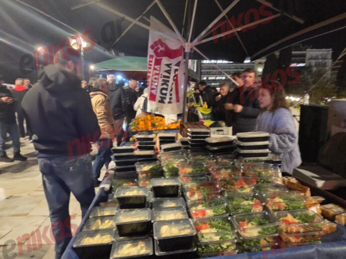 Προβατίνα, φρούτα, σαλάτες, κρουασάν, ψωμί, μπισκότα και νερά μοιράζονται τόσο στους πολίτες που συμμετέχουν στο μεγάλο συλλαλητήριο στο Σύνταγμα, όσο και στους αγρότες που αναμένεται να διανυκτερεύσουν έξω από την Βουλή.