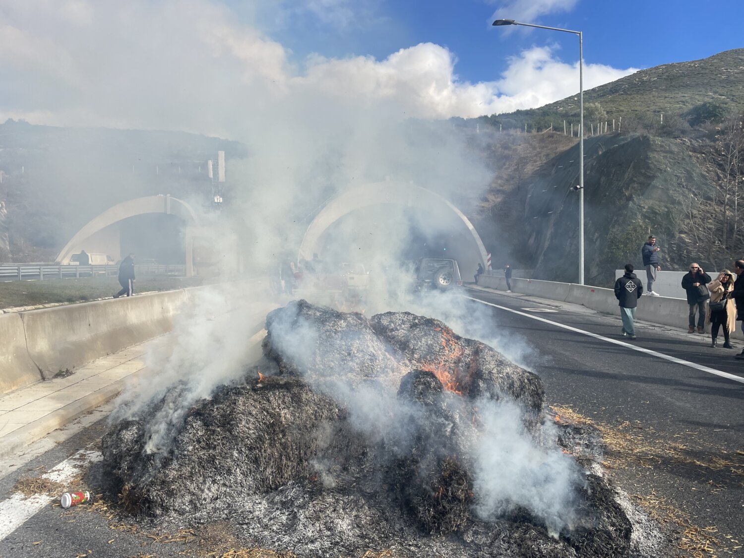 Σύμφωνα με το larissanet.gr, περίπου 140 τρακτέρ έφτασαν στο σημείο με κόρνες, ενώ αγρότες και κτηνοτρόφοι του μπλόκου της Νίκαιας έκαψαν μπάλες με άχυρο.