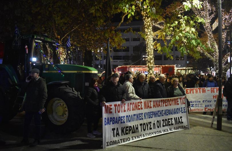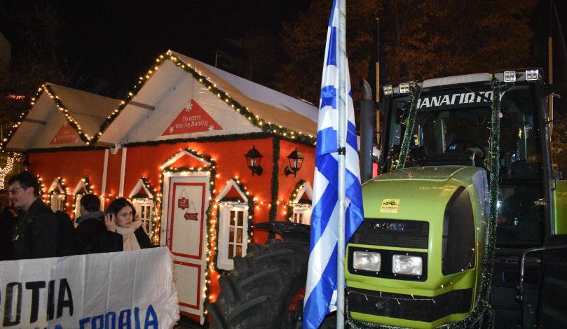 Η εικόνα της κεντρικής πλατείας ήταν πρωτόγνωρη, καθώς είναι στολισμένη χριστουγεννιάτικα και ταυτόχρονα γεμάτη τρακτέρ, αλλά και με πανό και διαδηλωτές.