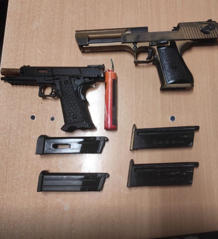 Ύστερα από έρευνα που έκαναν στο εσωτερικό του οχήματος εντόπισαν κάτω από την θέση του οδηγού δύο αεροβόλα πιστόλια, με τους γεμιστήρες τους, μην τηρώντας την κείμενη, για τη μεταφορά τους, νομοθεσία, καθώς και καπνογόνο και τρείς γεμιστήρες στο χώρο των αποσκευών, τα οποία κατασχέθηκαν.