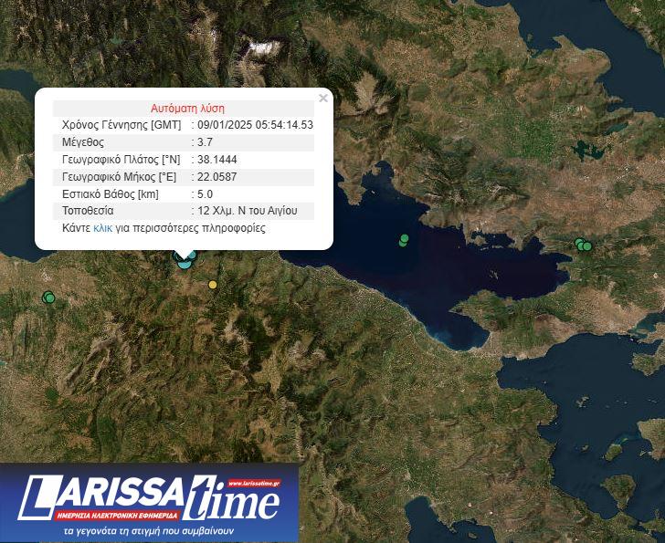 Σεισμός μεγέθους 3,7 Ρίχτερ σημειώθηκε λίγο πριν τις 8, με το επίκεντρο να εντοπίζεται 12χλμ. νότια του Αιγίου.