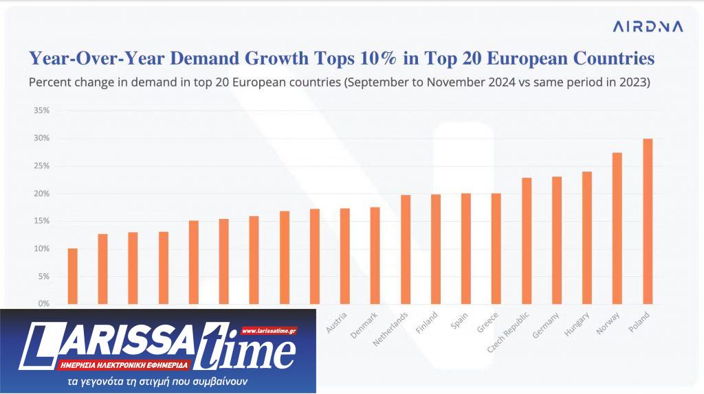 Σύμφωνα με τα στοιχεία της εξειδικευμένης εταιρείας AirDNA, η Ελλάδα με διψήφιο ποσοστό αύξησης 20,1% σε επίπεδο ζήτησης, συγκριτικά με το αντίστοιχο περσινό διάστημα, κατατάσσεται στην έκτη θέση μεταξύ των 20 υπό εξέταση ευρωπαϊκών κρατών.
