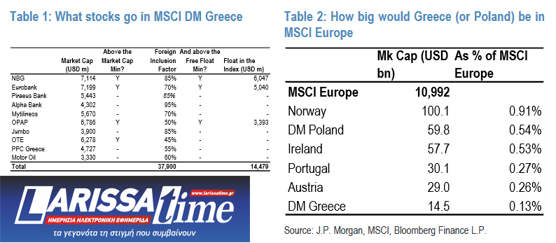 Σύμφωνα με την JP Morgan είναι πολύ απίθανο η Ελλάδα να αναβαθμιστεί, επειδή έχει μόνο τρεις μετοχές αυτής της ποιότητας για τον MSCI Europe, όπου τα βασικά εμπόδια είναι η κεφαλαιοποίηση αγοράς και η ελεύθερη διασπορά. Οι κανόνες του MSCI˖ για την ταξινόμηση της αγοράς είναι: