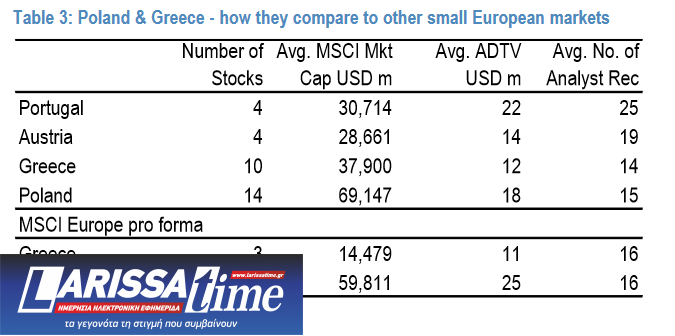 Όπως εξηγεί, η αναβάθμιση θα συρρικνώσει το επενδυτικό σύμπαν (το ελάχιστο όριο μεγέθους διπλασιάζεται από EM σε DM) και θα έκανε την Ελλάδα τη μικρότερη αγορά στην MSCI Europe με 13 μ.β. της MSCI Europe. Η Ελλάδα θα είναι μικρότερη από την Αυστρία ή την Πορτογαλία.