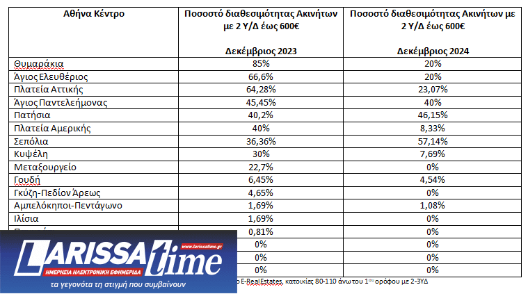 Συγκεκριμένα, στην περιοχή Θυμαράκια, το 2023, το ποσοστό διαθεσιμότητας κατοικιών με ζητούμενο μίσθωμα έως 600€ ήταν 85%, σήμερα δεν ξεπερνά το 20%. Η ίδια εικόνα καταγράφεται και στις περιοχές όπως, ο Άγιος Ελευθέριος, Πλατεία Αττικής, Πλατεία Αμερικής και στη Κυψέλη. Οι περιοχές του κέντρου που καταγράφουν τη μεγαλύτερη διαθεσιμότητα οικονομικών κατοικιών είναι τα Πατήσια, ο Άγιος Παντελεήμονας και τα Σεπόλια.