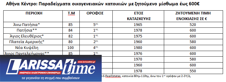 Η νέα έρευνα του Πανελλαδικού Δικτύου E-Real Estates για τις τιμές και τη διαθεσιμότητα των ενοικιαζόμενων ακινήτων στην Αττική είναι αποκαλυπτική, όσο και αποκαρδιωτική: Στο κέντρο της Αθήνας μόλις το 6,4% των διαθέσιμων προς μίσθωση ακινήτων, που είναι κατάλληλα για οικογένεια (80-100 τ.μ. με δύο υπνοδωμάτια, άνω του 1ου ορόφου) ενοικιάζονται ως 600 ευρώ.