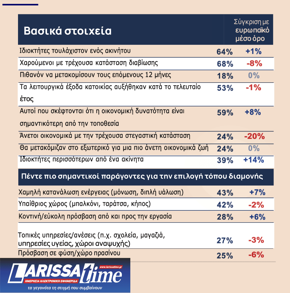 Παράλληλα, όσον αφορά τους Έλληνες που σκέφτονται να μετακομίσουν, το 59% των ερωτηθέντων δίνει προτεραιότητα στις οικονομικές τους δυνατότητες έναντι της τοποθεσίας ενός ακινήτου (ποσοστό αυξημένο κατά 8% σε σχέση με τον ευρωπαϊκό μέσο όρο).