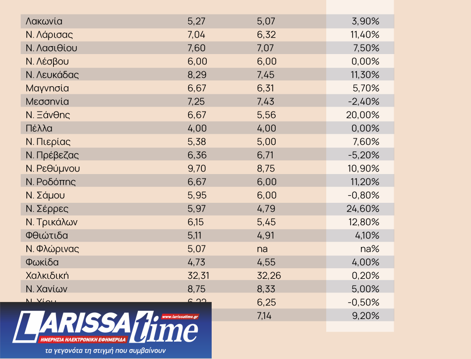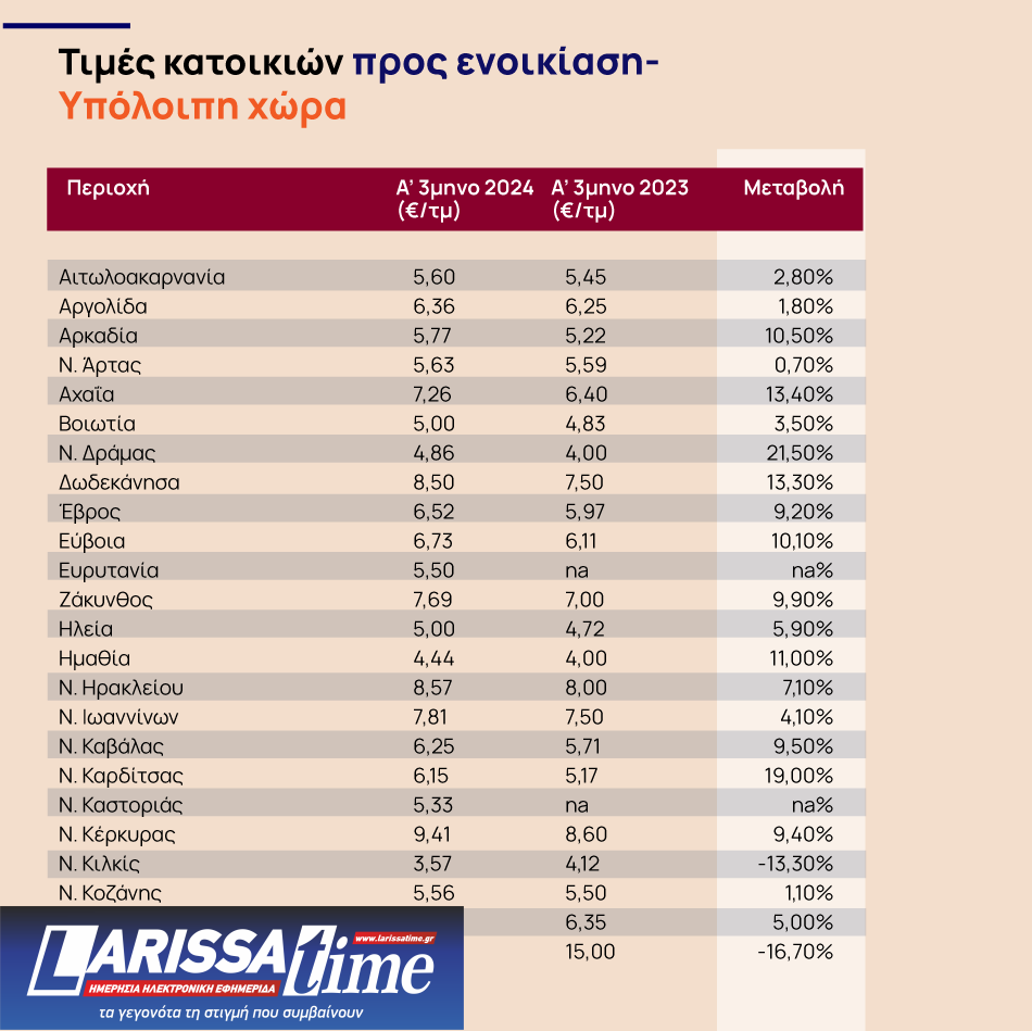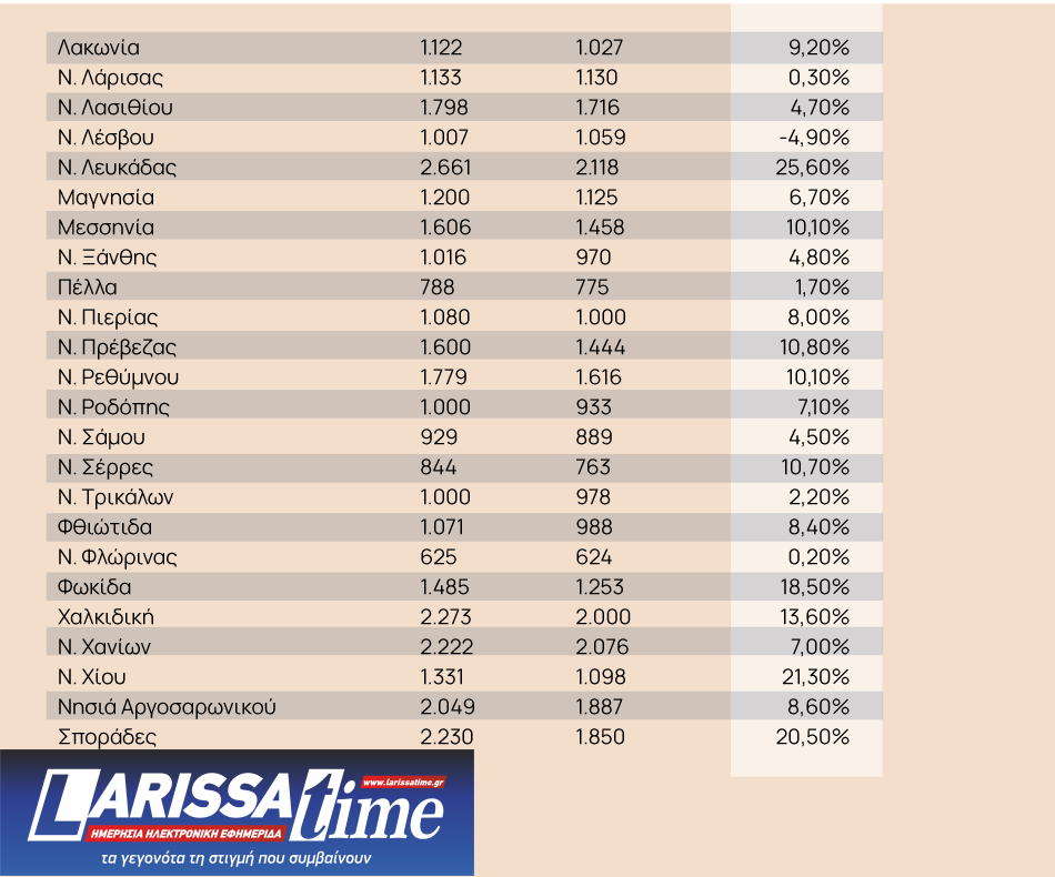 Η μεγαλύτερη αύξηση σε αυτό το τρίμηνο σε σχέση με το προηγούμενο έτος, καταγράφηκε στον Πειραιά με +27,30%, ενώ η μεγαλύτερη μείωση στην Καστοριά με -15,10%. Όσο για τις ενοικιάσεις, η χαμηλότερη τιμή καταγράφεται στο Κιλκίς με 3,57 ευρώ ανά τ.μ. και η υψηλότερη τιμή στη Χαλκιδική με 32,31 ευρώ ανά τ.μ.