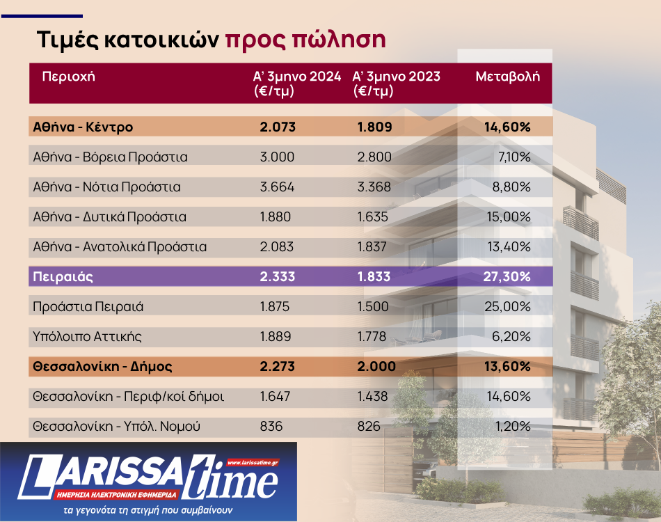 Στον αντίποδα, ο Πειραιάς σπάει όλα τα κοντέρ, καθώς οι ζητούμενες τιμές αυξήθηκαν με ρυθμό διπλάσιο συγκριτικά με το α’ τρίμηνο του 2023, κατακτώντας την κορυφή όσον αφορά την υψηλότερη ποσοστιαία άνοδο πανελλαδικά.