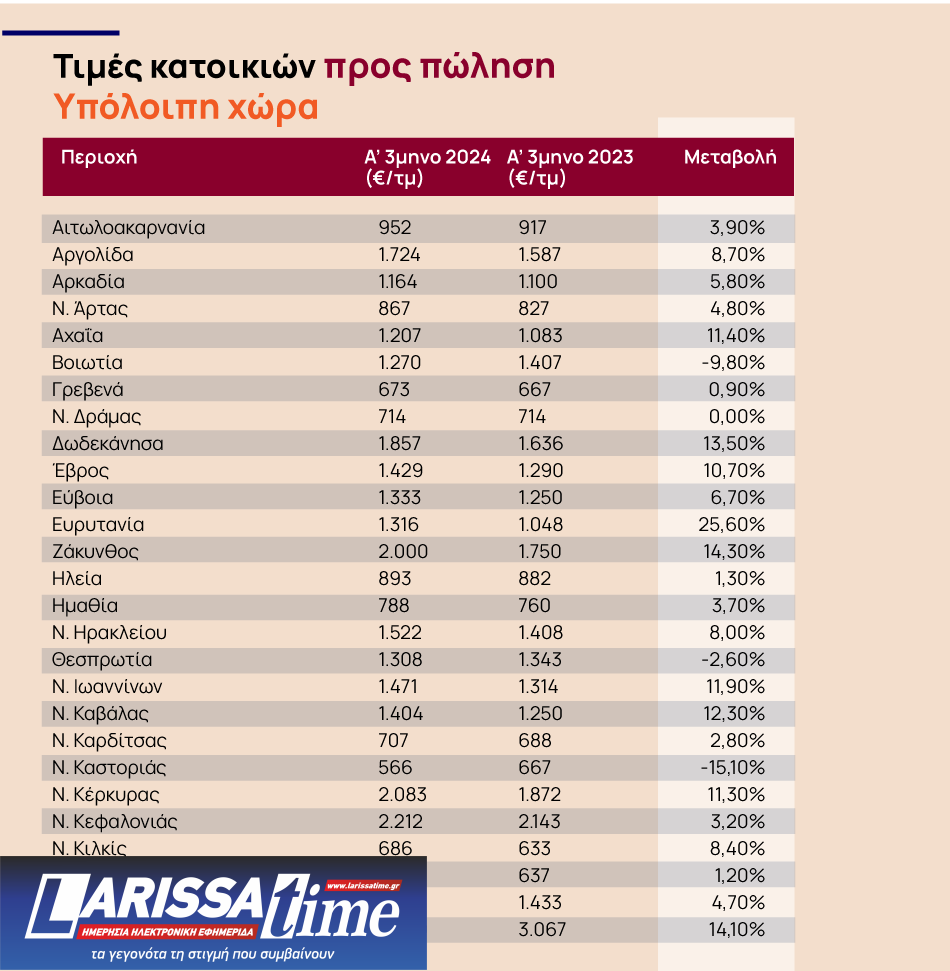 Πανελλαδικά, όπως προκύπτει από τις δημοσιευμένες αγγελίες των προσφερόμενων κατοικιών, κατά τη διάρκεια του Ιανουαρίου -Μαρτίου 2024, η μέση τιμή για τα σπίτια προς πώληση ήταν υψηλότερη στα νότια προάστια της Αθήνας, με 3.664 ευρώ ανά τετραγωνικό μέτρο και χαμηλότερη στην Καστοριά με 566 ευρώ ανά τετραγωνικό μέτρο.