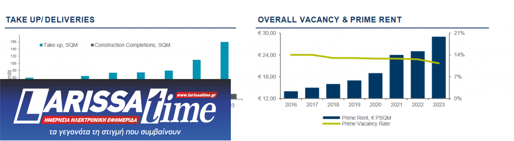 Το μέσο ενοίκιο των prime ακινήτων ανέβηκε στα 29 ευρώ ανά τ.μ., με ορισμένες συμφωνίες να ξεπερνούν το όριο των 30 ευρώ ανά τ.μ., σημειώνοντας αύξηση της τάξεως 12% σε σχέση με το 2022.