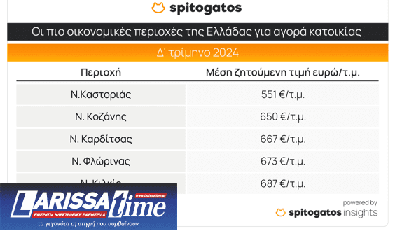 Στον αντίποδα, στις πιο οικονομικές περιοχές της Ελλάδας για αγορά κατοικίας, κατατάσσονται οι Νομοί Καστοριάς και Κοζάνης. Ακολουθούν οι Νομοί Καρδίτσας, Φλώρινας και Κιλκίς.