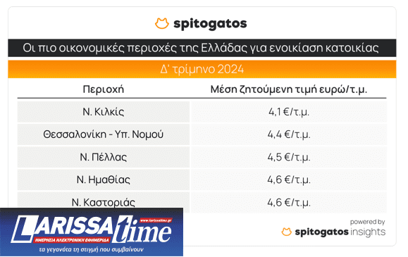 Στις πιο οικονομικές περιοχές της χώρας για ενοικίαση κατοικίας συναντάμε τα εξής: Νομός Κιλκίς, Υπόλοιπο Νομού Θεσσαλονίκης, Νομός Πέλλας, Νομός Ημαθίας και Νομός Καστοριάς.