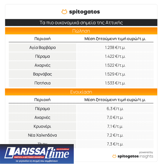 Οι πιο οικονομικές επιλογές στην Αττική για αγορά κατοικίας εντοπίζονται στην Αγία Βαρβάρα, στο Πέραμα, στις Αχαρνές, στον Βαρνάβα και στα Πατήσια. Αναφορικά με την ενοικίαση, οι περιοχές της Αττικής που κατέγραψαν την χαμηλότερη μέση ζητούμενη τιμή ενοικίασης κατοικίας κατά το 4ο τρίμηνο του 2024 είναι το Πέραμα και οι Αχαρνές, ενώ ακολουθούν το Κρυονέρι, η Νέα Χαλκηδόνα και το Ίλιον.