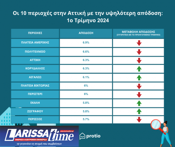 Για το πρώτο τρίμηνο του 2024 ο Κορυδαλλός και η ανερχόμενη γειτονιά της Πλατείας Αττικής παραμένουν στη λίστα με τις υψηλότερες αποδόσεις, με απόδοση 6.3%.