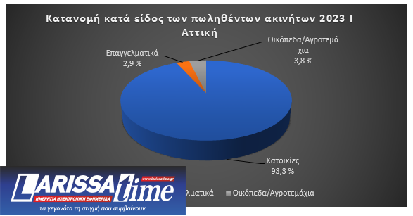 Στην Αττική, το 93,3% των πωληθέντων ακινήτων αφορούσε κυρίως σε κατοικίες (διαμερίσματα/μονοκατοικίες/μεζονέτες). Τα οικόπεδα-αγροτεμάχια κάλυψαν το 3,8% του συνολικού όγκου αγοραπωλησιών, ενώ το ποσοστό των επαγγελματικών ακινήτων ήταν 2,9%.