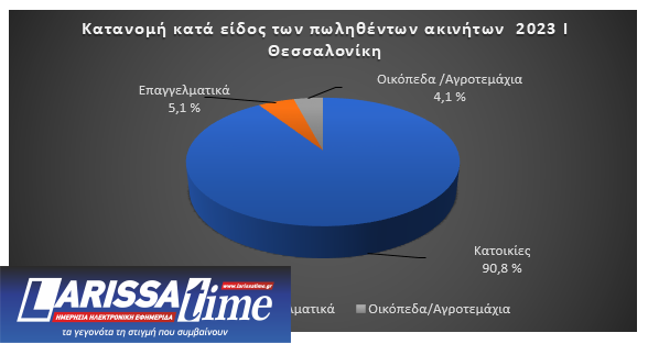 Στη δεύτερη μεγαλύτερη πόλη της χώρας, τη Θεσσαλονίκη, παρατηρείται μια αντίστοιχη τάση με την Αττική όσον αφορά στην προτίμηση κατοικιών, καθώς το 90,8% των πωληθέντων ακινήτων ανήκουν σε αυτή την κατηγορία. Ωστόσο, αξίζει να σημειωθεί ότι τα οικόπεδα-αγροτεμάχια καταλαμβάνουν ένα μικρότερο αλλά σημαντικό ποσοστό, της τάξεως του 4,1%, ενώ το ποσοστό των επαγγελματικών ακινήτων ανέρχεται στο 5,1%.