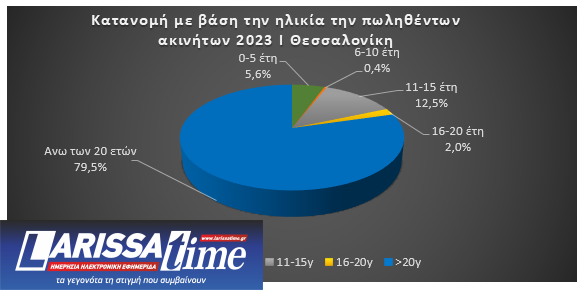 Στη Θεσσαλονίκη, παρατηρείται παρόμοια τάση με αυτή που διαμορφώνεται και στην Αττική. Τα μεγαλύτερα ποσοστά προτίμησης συναντώνται σε ακίνητα ηλικίας άνω των 20 ετών, φτάνοντας το 79,5%. Αντίθετα, τα νεόδμητα ακίνητα ηλικίας έως 5 ετών κινούνται σε χαμηλότερα επίπεδα με αυτά του 2022, καλύπτοντας το 5,6% των συνολικών αγοραπωλησιών, μείωση 2 ποσοστιαίων μονάδων.