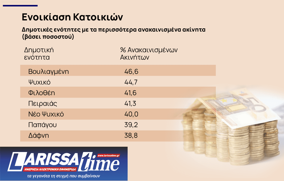 Ο Πειραιάς (41,3%) και το Νέο Ψυχικό (40,0%) εμφανίζουν επίσης υψηλά ποσοστά ανακαίνισης, ενώ οι περιοχές Παπάγου (39,2%) και Δάφνης (38,8%) συμπληρώνουν τη λίστα.