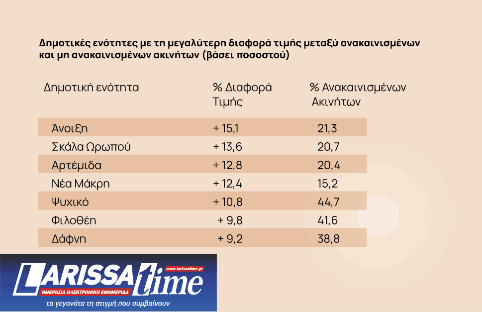 Οι υπόλοιπες περιοχές, όπως Περιστέρι (20,1%) και Ζωγράφου (20,9%), καταγράφουν μέτρια ποσοστά ανακαίνισης και μικρές θετικές διαφορές τιμών.