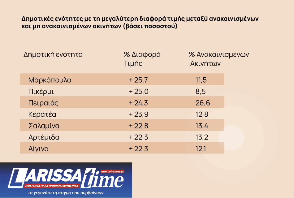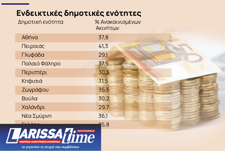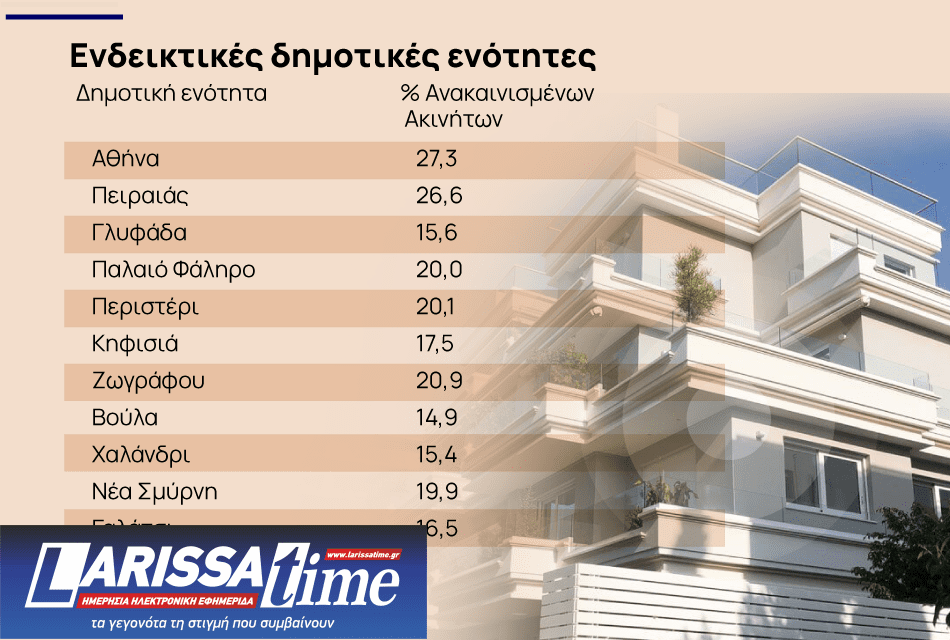 Περιοχές όπως η Αθήνα (37,8%) και ο Πειραιάς (41,3%) έχουν υψηλά ποσοστά ανακαινισμένων ακινήτων, με μικρές αλλά θετικές διαφορές στις τιμές, 8,6% και 8,9% αντίστοιχα.