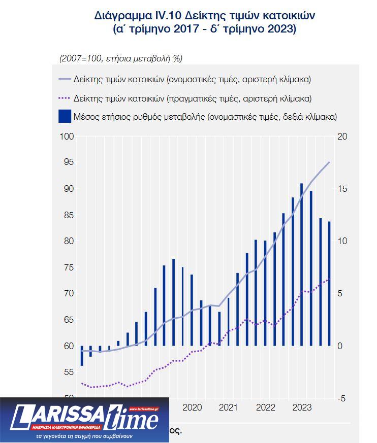 Με τις τιμές των κατοικιών να βρίσκονται στα ύψη, παρά τη μικρή επιβράδυνση που σημειώθηκε στα τελευταία τρίμηνα του 2023, στην Ετήσια Έκθεση του Διοικητή Γιάννη Στουρνάρα επισημαίνεται ότι «παρεμβάσεις προς την κατεύθυνση της ενίσχυσης της προσφοράς και του περιορισμού της επενδυτικής ζήτησης για οικιστικά ακίνητα (βραχυχρόνιες μισθώσεις, Golden Visa) σε περιοχές πρώτης κατοικίας εκτιμάται ότι θα μετριάσουν τους ρυθμούς αύξησης των τιμών και των μισθωμάτων και ενδεχομένως θα οδηγήσουν τοπικά και σε διορθώσεις τιμών».