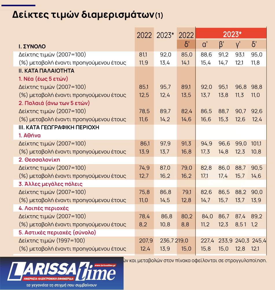 Για το σύνολο του 2023, η αύξηση των τιμών στις ίδιες περιοχές σε σχέση με το 2022 ήταν 13,7%, 16,2%, 14,5% και 10,8% αντίστοιχα. Τέλος, για το σύνολο των αστικών περιοχών της χώρας, το δ΄ τρίμηνο του 2023 οι τιμές των διαμερισμάτων ήταν κατά μέσο όρο αυξημένες κατά 12,1% σε σύγκριση με το δ΄ τρίμηνο του 2022, ενώ για το 2023 η μέση ετήσια αύξηση διαμορφώθηκε στο 13,9%.