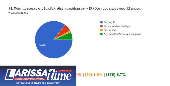 Ιδιαιτέρως απαισιόδοξοι εμφανίζονται οι ερωτώμενοι για το θέμα της ακρίβειας τη χρονιά που έρχεται. Στο ερώτημα «πώς πιστεύεται ότι θα εξελιχθεί η ακρίβεια στην Ελλάδα του επόμενους 12 μήνες, οι συμμετέχοντες στην έρευνα απαντούν σε ποσοστό 85,4% θα αυξηθεί, ενώ ένα 6,4% ότι θα παραμείνει σταθερή.