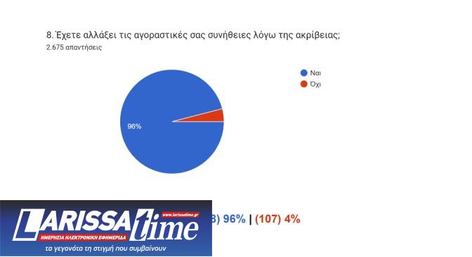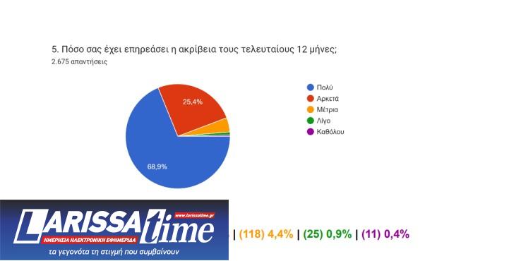 Όσον αφορά το πώς έχει επηρεάσει η ακρίβεια την ποιότητα της ζωής τους, ένα συντριπτικό ποσοστό που αγγίζει το 92,7% απαντά «αρνητικά» και «πολύ αρνητικά». Η πλειοψηφία των καταναλωτών απαντά επίσης ότι έχει συμμετάσχει σε κοινωνικές ή πολιτικές δράσεις κατά της ακρίβειας (62,7%).